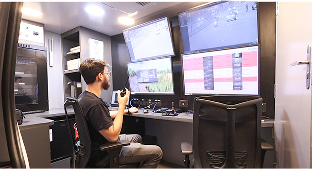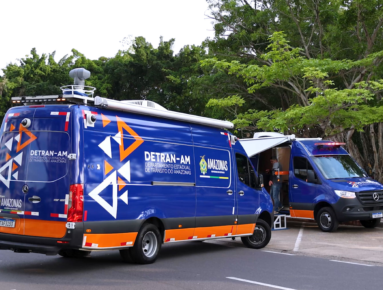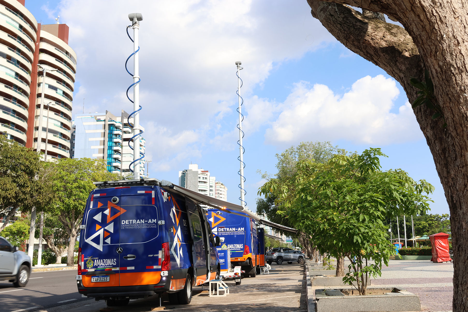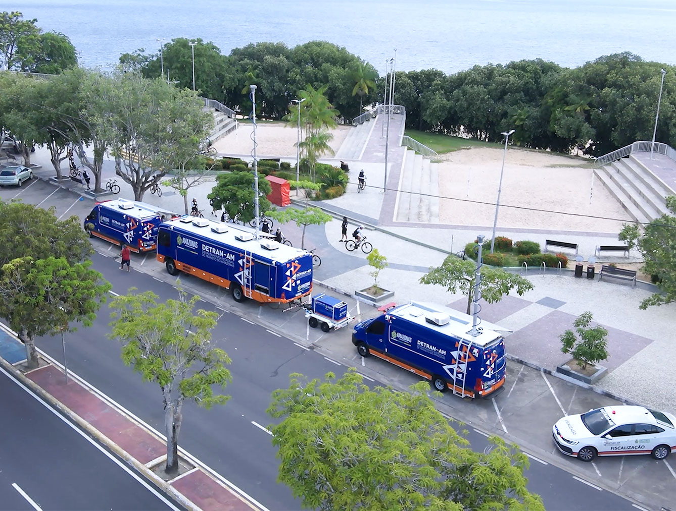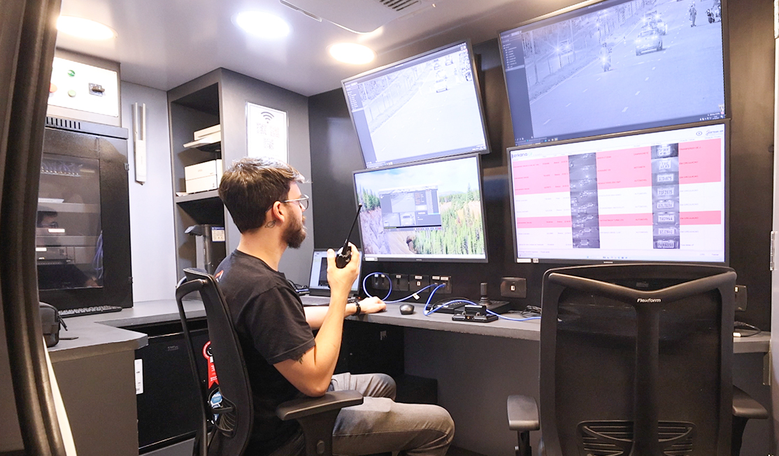 As unidades móveis (vans e ônibus) utilizam Roteador 5G e Internet via Satélite, garantindo decisões rápidas em campo. Nelas, estão embarcadas soluções de segurança e fiscalização como leitura de placas (LPR) integrada ao banco do Detran, reconhecimento facial SAFR com alta precisão e sistema de download automático de gravações para armazenamento seguro de evidências.